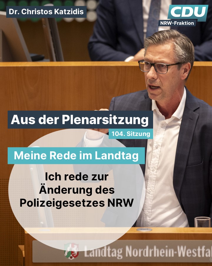 mehr🎥 Heute habe ich im #Plenum zur Änderung des Polizeigesetzes des Landes Nordrhein-Westfalen gesprochen. Hier gibt es aufgrund verschiedener Entscheidungen des Bundesverfassungsgerichtes zu Polizeigesetzen anderer Bundesländer Anpassungsbedarf. Außerdem stärken wir mit der Novellierung den #Opferschutz, in dem wir unserer Polizei die Befugnis einräumen, häusliche Schläger künftig nicht nur für 10 Tage aus einer Wohnung zu verweisen, sondern 14 Tage.👉 Schaut euch hier meine Rede an!#Plenarrede #Plenartage #LTNRW #NRWkommtvoran #GuterPlan #CDU #CDUDeutschland #WegenMorgen #TeamCDU #CDULandtagsfraktionNRW #CDUFraktionNRW #TeamWüst #TeamCDUNRW #ChristosKatzidis #KlartextKatzidis #KommissarKatze