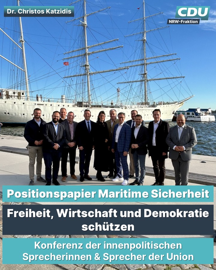 mehr🚨Ergebnis unserer diesjährigen Herbstkonferenz der innenpolitischen Sprecherinnen und Sprecher der Union in Stralsund⚓Drei Tage lang stand in der letzten Septemberwoche ein Thema im Mittelpunkt, das aktueller kaum sein könnte: Maritime Sicherheit.Krieg, Terror und gezielte Angriffe auf kritische Infrastrukturen haben das Sicherheitsgefühl in Deutschland spürbar verändert. Die Bedrohungslage wächst, nicht nur an Land, sondern auch auf See. Als Union stehen wir für einen handlungsfähigen Staat, der Sicherheit gewährleistet, seine Interessen schützt und seine Bürgerinnen und Bürger konsequent vor neuen Gefahrenlagen verteidigt. Unbekannte Drohnen, Angriffe auf Seewege, Sabotageakte in Häfen und Bedrohungen sensibler Anlagen wie LNG-Terminals sind keine bloßen Wirtschaftsfragen ? sie sind Angriffe auf unsere freiheitliche und demokratische Grundordnung.👉 Maritime Sicherheit ist daher eine strategische Kernaufgabe deutscher Innen- und Sicherheitspolitik.In Stralsund haben wir ein Positionspapier mit einem 10-Punkte-Plan beschlossen, um Deutschlands maritime Sicherheit effektiv zu stärken:https://www.christos-katzidis.de/image/daten/news_20251008135522_isk_union__positionspapier_maritime_sicherheit.pdf1️⃣ Maritime Sicherheit als sicherheitspolitische Priorität verankernSie muss in der nationalen Sicherheitsstrategie fest verankert und ressortübergreifend koordiniert werden ? mit klarer Zuständigkeit im Kanzleramt.2️⃣ Kritische maritime Infrastruktur umfassend schützenHäfen, Pipelines, Offshore-Windparks und LNG-Terminals brauchen verpflichtende Sicherheitsstandards, überwachte Schutzzonen und bessere Zusammenarbeit zwischen Bund, Ländern und Behörden.3️⃣ Drohnenabwehr in sensiblen Küstenzonen ausbauenKlare rechtliche Grundlagen und modernste Technik für die Abwehr unbemannter Systeme zum Schutz sensibler Anlagen.4️⃣ Bundespolizei See gezielt modernisieren und stärkenMehr Personal, modernste Ausstattung und digitale Fähigkeiten, um Kriminalität, Spionage und Sabotage auf See effektiv zu bekämpfen.5️⃣ Digitale Lagedominanz: KI, Vernetzung, EchtzeitüberwachungEin vernetztes Lagebild in Echtzeit durch KI, Satellitendaten und Sensorik für schnellere Reaktionen auf Bedrohungen.6️⃣ Hybride Angriffe und verdeckte Operationen rechtssicher bekämpfenNeue gesetzliche Grundlagen für verdeckte Ermittlungen und Cyberabwehr bei maritimen Bedrohungen.7️⃣ Hafensicherheit auf ein neues Niveau hebenMehr Kontrollen, KI-basierte Analysen und besseren Schutz vor Spionage, Cyberangriffen und Sabotage in strategisch wichtigen Häfen.8️⃣ Verteidigungspolitik maritim denken und strategisch ausrichtenStärkere Präsenz der Marine in Nord- und Ostsee, Spezialeinheiten gegen Unterwasser-Sabotage und enge Kooperation mit NATO-Partnern.9️⃣ Forschung, Technologie und Ausbildung systematisch fördernDeutschland soll führender Standort für maritime Sicherheit werden ? mit gezielter Förderung von KI, Sensorik und Drohnenabwehr sowie spezialisierter Ausbildung.🔟 Altmunition in Nord- und Ostsee räumenDie systematische Beseitigung von 1,6 Millionen Tonnen Weltkriegsmunition ist ein Gebot staatlicher Verantwortung für Umwelt, Wirtschaft und Sicherheit.#InnereSicherheit #ISKUnion2025 #ISKUnion #CDU #Innenpolitik #StarkerStaat #cdu #cdudeutschland #wegenmorgen #teamcdu #cdulandtagsfraktionnrw #cdufraktionnrw #teamwüst #teamcdunrw #christoskatzidis #klartextkatzidis #kommissarkatze