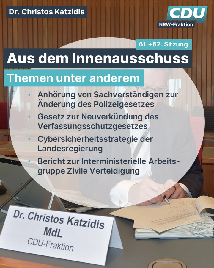 mehr☀️ Guten Morgen aus dem #Landtag.🚨 Heute tagt der #Innenausschuss gleich zweimal. ➡️ Um 10:30 Uhr startet die Anhörung von Sachverständigen zum achten Gesetz zur Änderung des Polizeigesetzes des Landes Nordrhein-Westfalen. ➡️ Um 13:30 Uhr folgt die reguläre Ausschusssitzung. Auf der Tagesordnung stehen wichtige Themen zur #InnerenSicherheit in #NRW ? unter anderem befassen wir uns mit der Neuverkündung des Verfassungsschutzgesetzes und der Cybersicherheitsstrategie der Landesregierung.Schaut gerne über den Live-Stream zu: https://www.landtag.nrw.de/home/mediathek/aktuelle-und-kunftige-live-ubert.html#InnereSicherheit #innendienst #ltnrw #NRWkommtvoran #guterplan #cdu #cdunrw #wegenmorgen #teamcdu #cdufraktionnrw #teamwüst #teamcdunrw #christoskatzidis #klartextkatzidis #kommissarkatz