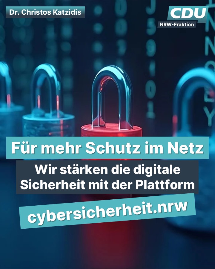 mehr💻Für mehr Schutz im Netz!🔒🛡 Wir stärken den Cybersicherheitsstandort #NRW und bauen die digitale Sicherheit der Bürgerinnen und Bürger weiter aus. Seit dieser Woche ist die überarbeitete Plattform cybersicherheit.nrw online. Dort finden Privatpersonen, Unternehmen, Schulen und Hochschulen alle wichtigen Informationen, konkrete Hilfen und praxisnahe Tipps, um sich sicher und informiert im Netz zu bewegen. Die neue Website bietet alles, was man für den digitalen Alltag braucht:✅ Tipps und Tricks zum Schutz vor Cyberangriffen✅ Schnelle Hilfe im Notfall✅ Infos, Hintergrundwissen und Veranstaltungen rund um Cybersicherheit in NRWMit dem modernisierten Portal setzt die #Landesregierung ein klares Signal: Cybersicherheit geht uns alle an. Unterstützung und aktuelle Angebote sind jetzt nur einen Klick entfernt: https://www.cybersicherheit.nrw/#Sicherheit #Cybersicherheit #DigitaleSicherheit #CDU #TeamCDU #ChristosKatzidis #KlartextKatzidis #NRWkommtvoran #wegenmorgen #StarkerStaat #Verantwortung #Deutschland