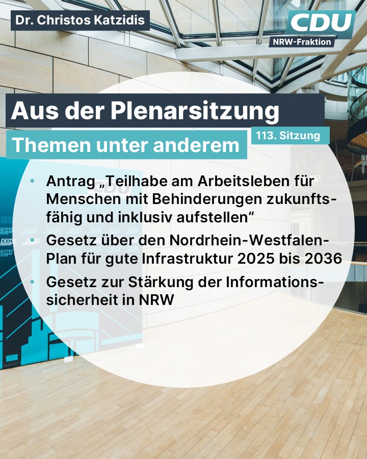 ☀️ Guten Morgen aus dem #Landtag🚨Heute startet um 10:00 Uhr die #PlenarsitzungIn der heutigen Plenarsitzung setzen wir die Beratungen zum Haushaltsplan 2026 fort und befassen uns unter anderem mit dem Gesetz zur Regelung der Zuweisungen des Landes an die Gemeinden und Gemeindeverbände für das kommende Jahr. Außerdem bringen wir einen Antrag ein, um die Teilhabe am Arbeitsleben für Menschen mit Behinderungen zukunftsfähig und inklusiv aufstellen.💻 Schaut gerne über den Live-Stream zu: https://www.landtag.nrw.de/home/mediathek/aktuelle-und-kunftige-live-ubert.html#InnereSicherheit #Innenausschuss #LandtagNRW #NRWkommtvoran #guterplan #cdu #cdunrw #wegenmorgen #TeamCDU #TeamWüst #CDUFraktionNRW #ChristosKatzidis #KlartextKatzidis #KommissarKatze