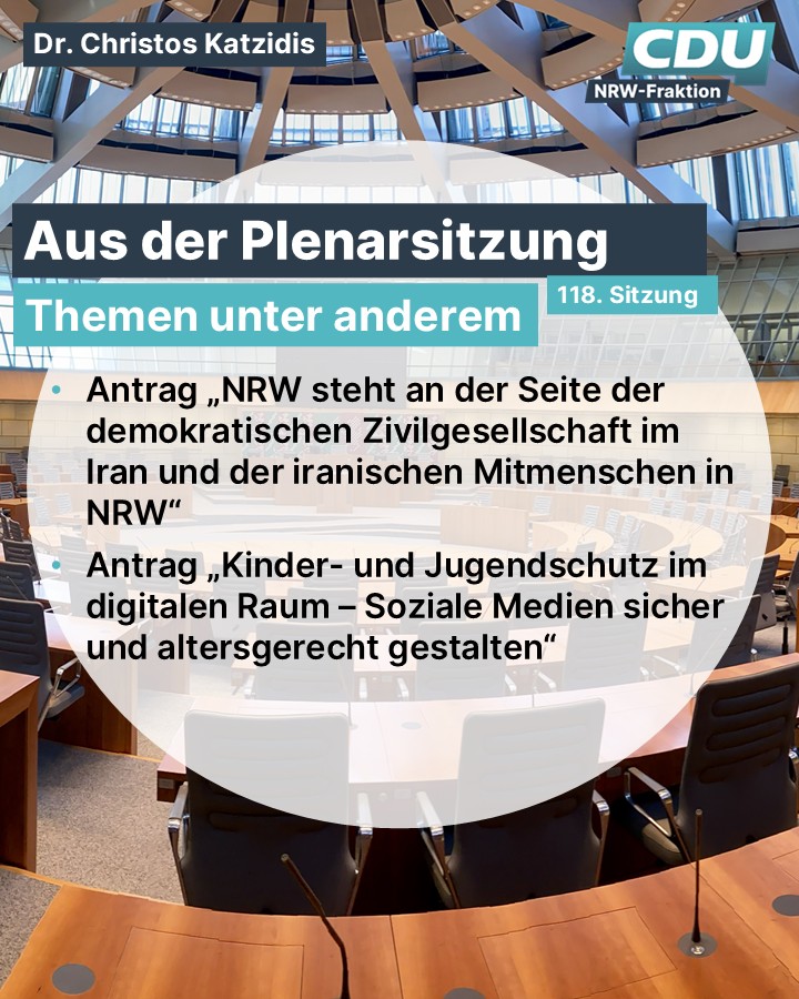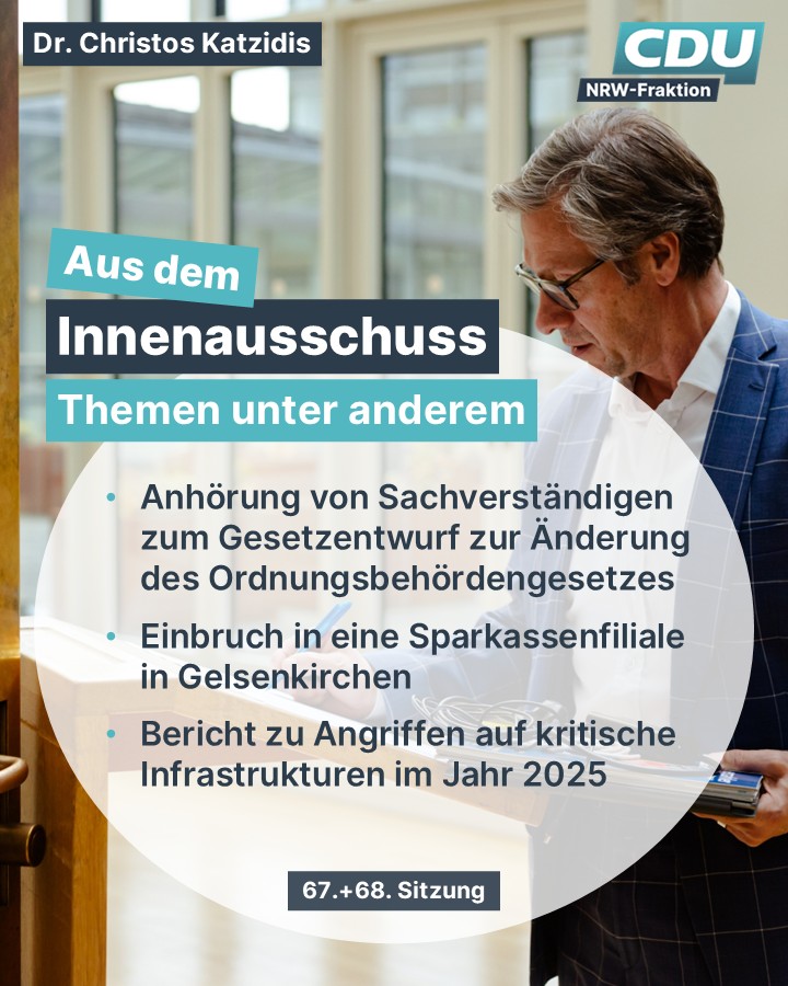 ☀️ Guten Morgen aus dem #Landtag🚨Heute startet um 11:00 Uhr der #Innenausschuss mit einer Anhörung von Sachverständigen zur Änderung des OrdnungsbehördengesetzesUm 13:30 geht es dann weiter mit der regulären Sitzung. Auf der Tagesordnung stehen wieder wichtige Themen zur #InnerenSicherheit in #NRW. 👉 Berichte der Landesregierung zu Drohnen und Angriffe auf KRITIS in 2025👉 Einsatzlage von Polizei, Feuerwehren und Rettungskräften in der Silvesternacht👉 Verfahrensstau bei den Staatsanwaltschaften ? Auswirkung auf die Polizei👉Einbruch in eine Sparkassenfiliale in GelsenkirchenIch bin gespannt auf die Diskussionen und den Austausch zu diesen zentralen Themen unserer Sicherheits- und Innenpolitik.💻 Schaut gerne über den Live-Stream zu: https://www.landtag.nrw.de/home/mediathek/aktuelle-und-kunftige-live-ubert.html#InnereSicherheit #Innenausschuss #LandtagNRW #NRWkommtvoran #guterplan #cdu #cdunrw #wegenmorgen #TeamCDU #TeamWüst #CDUFraktionNRW #ChristosKatzidis #KlartextKatzidis #KommissarKatze