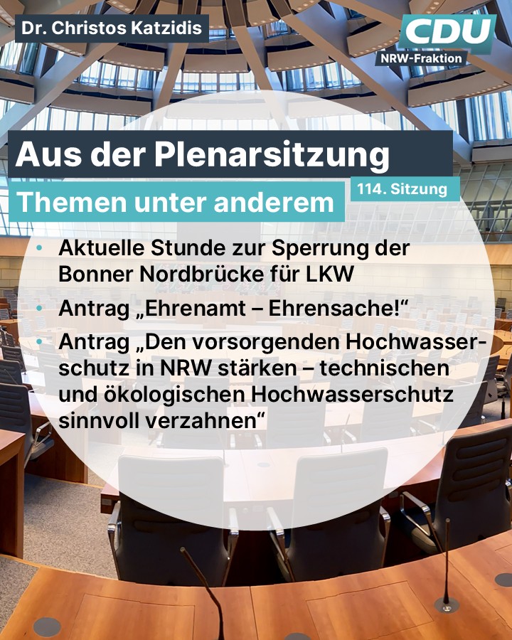 ☀️ Guten Morgen aus dem #Landtag🚨Heute startet um 10:00 Uhr die #Plenarsitzung Wir beginnen die letzte Plenarsitzung des Jahres mit einer Aktuellen Stunde zur Bonner Nordbrücke. Außerdem bringen wir einen wichtigen Antrag zur Stärkung des Ehrenamts in NRW ein, um die Voraussetzungen für den Zugang zur Ehrenamtskarte zu erleichtern. Ich freue mich auf spannende Debatten zum Jahresabschluss im Plenum. 💻 Schaut gerne über den Live-Stream zu: https://www.landtag.nrw.de/home/mediathek/aktuelle-und-kunftige-live-ubert.html#InnereSicherheit #Innenausschuss #LandtagNRW #NRWkommtvoran #guterplan #cdu #cdunrw #wegenmorgen #TeamCDU #TeamWüst #CDUFraktionNRW #ChristosKatzidis #KlartextKatzidis #KommissarKatze